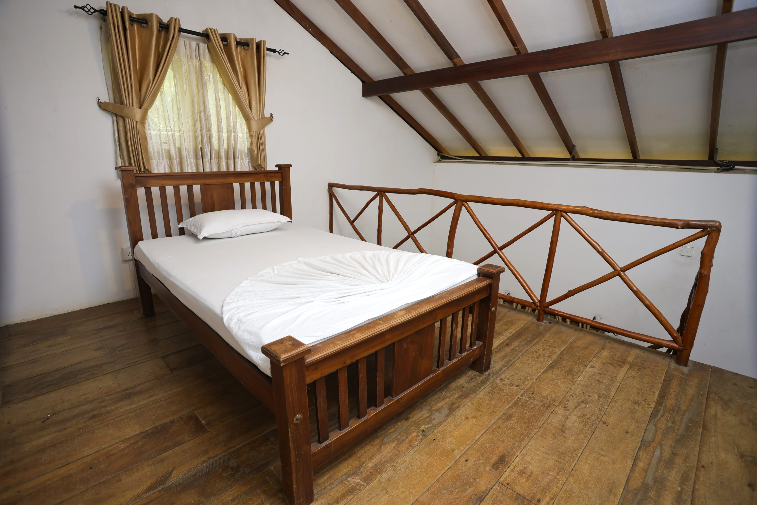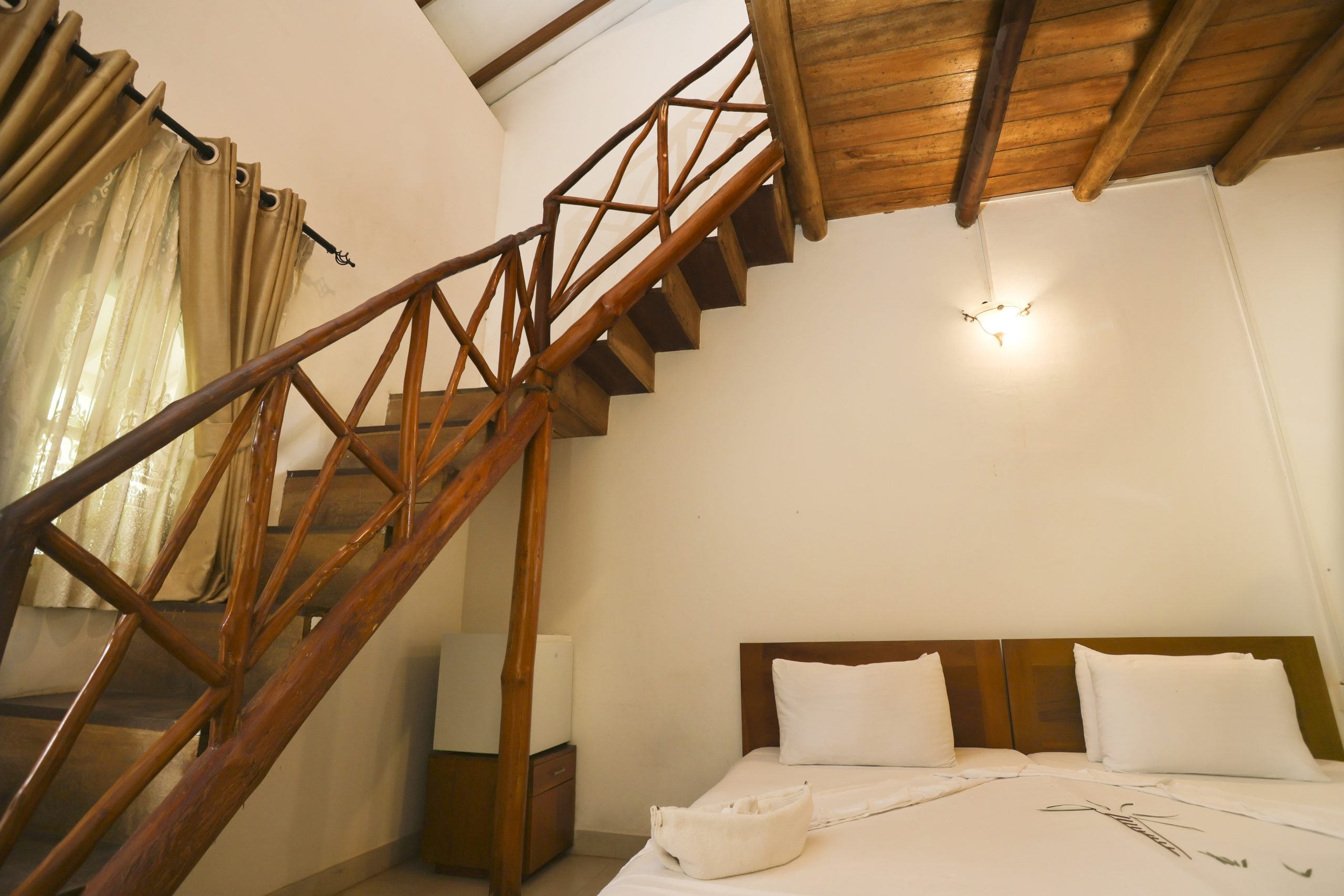 Tucked amidst lush greenery in the peaceful Serenity Village, Room 102 is a charming hideaway that blends rustic elegance with modern comfort. A warm yellow exterior welcomes guests, with stone-paved pathways and tropical foliage setting the tone for a nature-inspired retreat. Inside, the room boasts airy, high ceilings with exposed wooden beams, tastefully crafted bamboo furniture, and large windows that let in abundant natural light. A comfortable double bed, cozy sitting area, and a loft-style upper level create a unique layout perfect for families or couples. The private veranda offers a tranquil view of the surrounding garden, ideal for morning coffee or a quiet read. Thoughtful decor, like handmade botanical wall art, adds a personal touch, making Room 102 feel like a true home away from home.